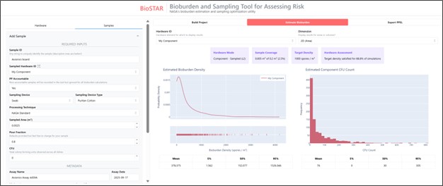 BioSTAR dashboard application. Left: Hardware component and sampling event inputs. Right: Bioburden density and spore count probability distribution outputs. The user can export this information in a PPEL format provided by the BioSTAR tool and import later for future iterations.
